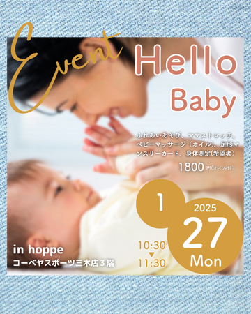 特定非営利活動法人ほっぺ(兵庫県三木市・代表:大森 奈津子)は親子向けイベントとして、2025年1月27日(月)にhoppe(コーベヤスポーツ三木店3階)にて、ふれあいあそびやベビーマッサージ体験ができる「Hello Baby」を開催いたします。