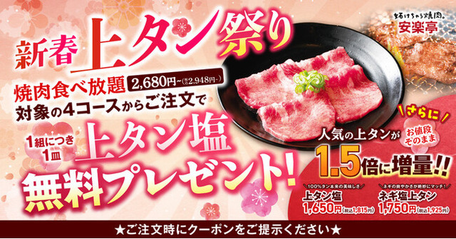 「新春 上タン祭り!」では、自慢の上牛タンをおトクにご提供します。お正月はご家族やご友人とご一緒に、安楽亭の「元タン」をお楽しみください。