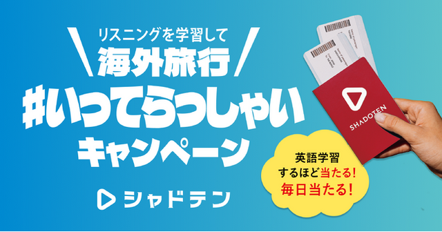 年始は新たな目標を掲げる絶好のタイミング。「今年こそ英語学習を頑張ろう」と考えている方も多いのではないでしょうか。シャドテンでは、そんな英語学習者を応援すべく、#いってらっしゃい キャンペーンを実施いたします。本キャンペーンは、シャドテン史上最大規模のプレゼント企画で、シャドテンで英語学習した人の中から毎日1名様に、航空券代や宿泊費などで使える海外旅行券10万円分(※)をプレゼントいたします。