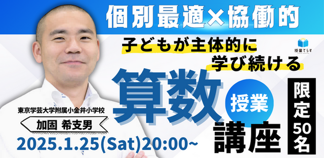 株式会社NIJIN(本社:東京都江東区、代表取締役:星野達郎)が運営する教員研修プラットフォーム『授業てらす』は、全国の小中学校教員を対象に、加固希支男先生の授業動画をオンラインで見て学ぶ「子どもが主体的に学び続ける算数授業講座~個別最適×協働的~」を、2025年1月25日(土)に開催いたします。
