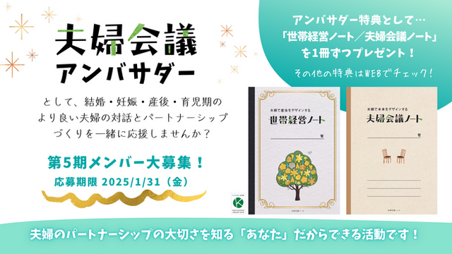 キッズデザイン賞受賞の夫婦会議ツール「世帯経営ノート」のプレゼントなど、特典いっぱいな『夫婦会議アンバサダー(R)』の活動の詳細と募集内容を以下でご紹介します。