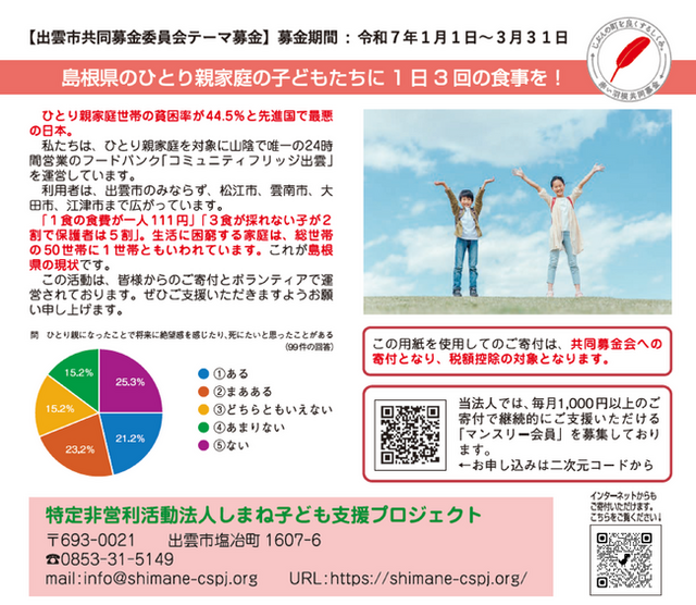 今年度は、ひとり親世帯を対象に食品等を提供する特定非営利活動法人しまね子ども支援プロジェクトが参加し、『島根県のひとり親家庭の子どもたちに1日3回の食事を!』をテーマに掲げ、目標額100万円の募金活動を行います。