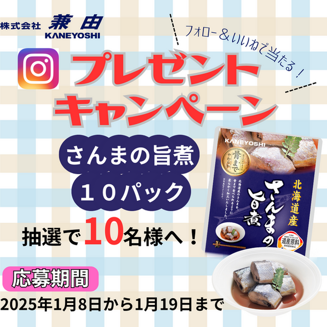 株式会社 兼由(北海道根室市落石西114番地 代表取締役 濱屋高男)は1月8日(水)から、公式SNSキャンペーンを開始します。賞味期間が2年のレトルト煮付けシリーズを通して災害への備えについて考えるきっかけづくりとして実施します。公式Instagramをフォローして対象投稿をいいねでさんまの旨煮(10パック)を10名様、公式Xをフォローして対象投稿をリポストでさんまの味噌煮(10パック)を10名様へそれぞれ抽選でプレゼントします。