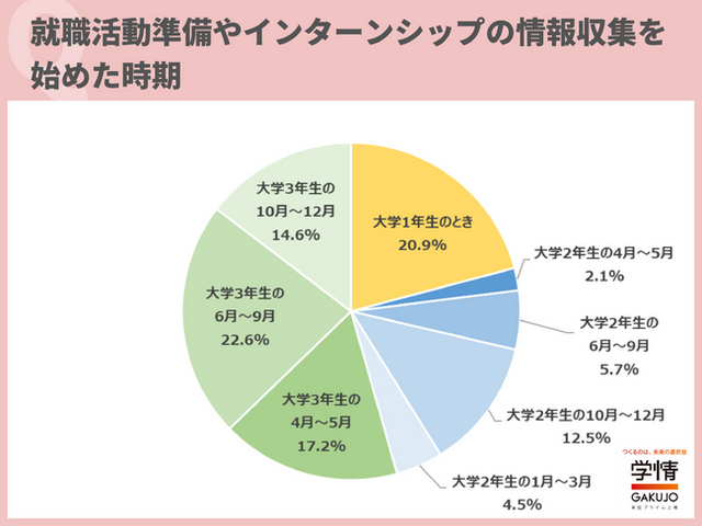 就職活動準備やインターンシップの情報収集を始めた時期は「大学3年生の6月~9月」が22.6%で最多となりました。「大学1年生のとき」20.9%となっており、2割の学生が、大学1年生のときから、情報収集を開始していることが明らかになりました。大学2年生のときと回答した学生は24.8%で、半数に迫る学生が大学1・2年生のときからインターンシップの情報収集を開始していることが分かります。
