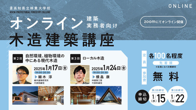 建築家・隈研吾氏が校長を務める高知県立林業大学校(高知県香美市)は、木造建築について学ぶオンライン講座(主催:高知県立林業大学校、後援:公益社団法人 日本建築士会連合会/一般社団法人 高知県木材協会)を開催いたします。各回異なるテーマ・講師による、全3回の公開講義です。