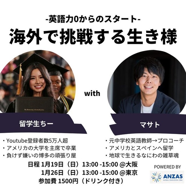今回のイベントでは、アメリカ大学主席卒業という輝かしい実績を持つ「留学生ちー」が、自身の海外での経験や挑戦について赤裸々に語ります。また、プロの英語コーチ「マサト」が、英語学習のモチベーションを高める秘訣などを解説します。