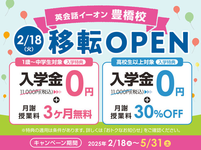 英会話教室を運営する株式会社イーオン(本社:東京都新宿区、代表取締役社長:重野卓、以下「イーオン」)は、2025年2月18日にイーオン豊橋校を移転オープンいたします。