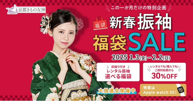 京都きもの友禅株式会社(本社所在地:東京都中央区日本橋大伝馬町14-1)は、2025年1月3日(金)より全国42店舗で、2026年以降に成人式を迎えられる方を対象にした「新春振袖福袋SALE&大抽選会」を開催いたします!