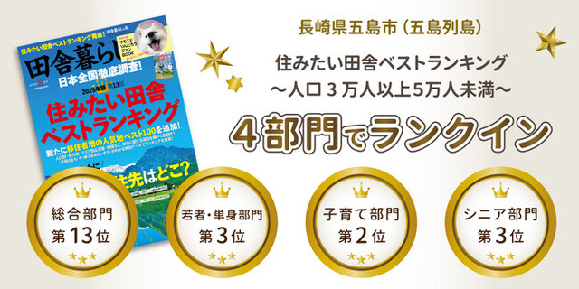 五島列島・五島市(長崎県)は、宝島社『田舎暮らしの本』2月号、「2025年版 住みたい田舎ベストランキング』人口3万人以上5万人未満のまちの4部門でランクイン!うち1部門は第2位、2部門は第3位という結果になりました。