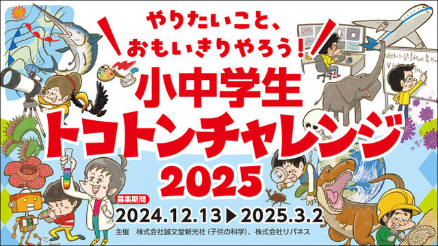 株式会社誠文堂新光社(東京都文京区)が発行する小中学生向けの科学雑誌『子供の科学』は、株式会社リバネス(東京都新宿区)との共催で、子供たちの「好き」「やりたい」をサポートする次世代教育プログラム「小中学生トコトンチャレンジ2025」を開催。小中学生からの申請を募集しています。