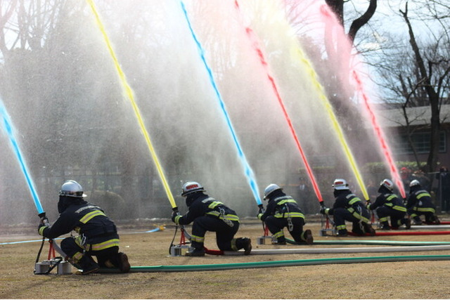 消防車両の機動力と迫力を感じていただき、水幕により形成された水のカーテンをキャンバスに見立てて、色鮮やかな放水で描いてまいります。