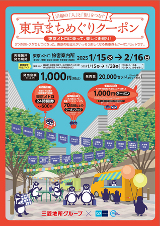 東京地下鉄株式会社(本社:東京都台東区、代表取締役社長:山村 明義、以下「東京メトロ」)は、三菱地所株式会社(本社:東京都千代田区、代表執行役 執行役社長:中島篤、以下「三菱地所グループ」)と連携し、2025年1月15日(水)から、「沿線の『人』と『街』をつなぐ」をコンセプトとした「東京まちめぐりクーポン」を1,000円(税込)で発売します。