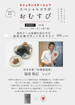 夢のコラボキャンペーンの第六弾は、『料理屋稲家』 (北新地)稲家敬記シェフが調理した「和牛テール味噌のおむすび~稲家定番の牛しぐれをそえて~」です。