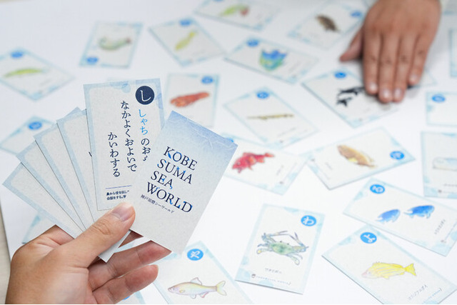 株式会社マテックス(モリト株式会社のグループ会社)が繊維廃材から再生したリサイクルペーパー「ASUKAMI(R)(アスカミ)」から制作しており、イラスト・監修はさかなのおにいさん かわちゃんが手掛けています。神戸須磨シーワールドで展示している生きものが題材となっており、生態や特徴を学べる楽しいかるたです。