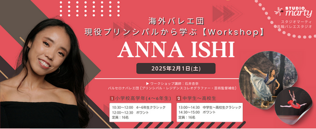 海外バレエ団 現役プリンシパルによる特別ワークショップを2月1日(土)に開催します。このイベントは、日常のバレエレッスンではなかなか接することのできない「現役プリンシパル」をお招きし、充実したバレエレッスンを通して様々な経験・成長のきっかけを体感していただくべく、未来のバレエダンサー(小学4年生~高校生まで)を対象にしたものです。