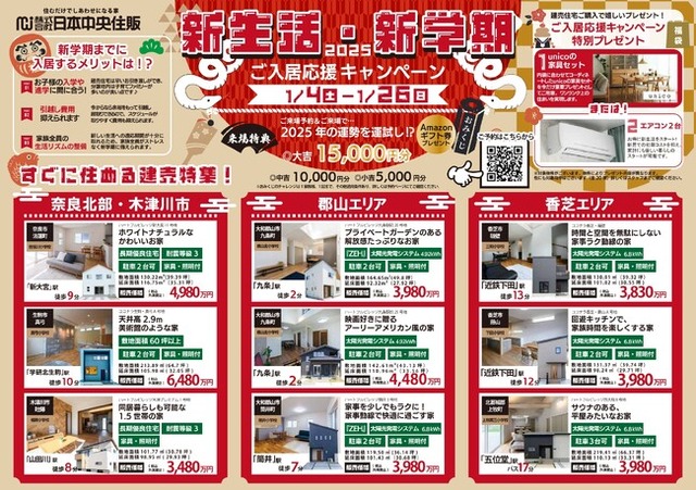 株式会社日本中央住販は1月4日(土)から26日(日)まで「新春キャンペーン」を開催します。期間中にご予約の上、ご来場いただいた方には、特製福袋をプレゼント。さらに、最大15,000円分のギフト券が当たるおみくじのチャンスもご用意しています。また、新学期に向けた「建売・モデルハウス見学会」も同時開催!私たちの高品質な住まいをご覧いただきながら、新しい暮らしを想像してみませんか?