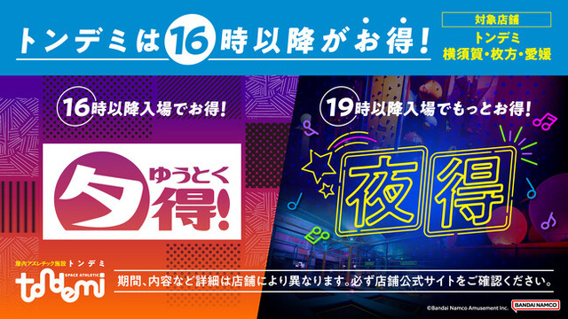 株式会社バンダイナムコアミューズメントは、屋内アスレチック施設『トンデミ横須賀』『トンデミ愛媛』にて16時以降の入場でお得な「夕得」・19時以降の入場でもっとお得な「夜得」(※1)を実施します。