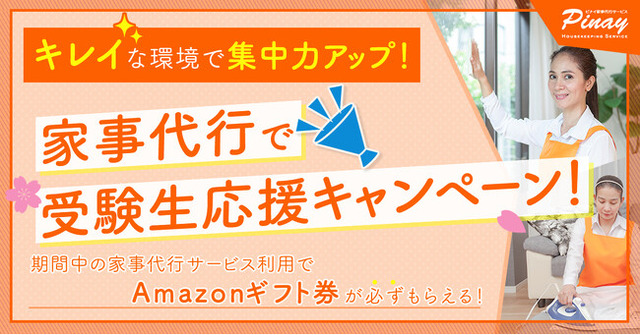 キャンペーン期間中、受験生がいるご家庭でピナイ家事代行サービスの「スポットプラン」をご利用いただいた方全員にAmazonギフト券3,000円分をプレゼントいたします。