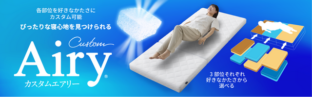 今回発売する「カスタムエアリー」は、頭部・腰部・脚部の部位ごとの表裏に硬さの異なる2枚の中材(1枚目:スーパーソフト・ソフト、2枚目:スーパーハード・ハード)を重ねた構造になっています。これらの中材の向きや順番を最大64通りに組み替えることで、個別の部位の硬さを自分の好みに調節できます。商品サイト内にある「カスタムエアリー診断(※4)」の質問に回答することで、身体の状態や就寝時の姿勢、理想の寝心地といった観点から最適なマットレスの種類を知ることができるため、自分に合ったマットレスに調整できます。
