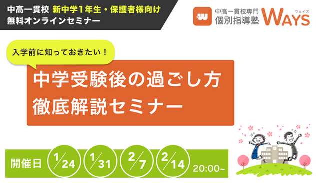 そこで本セミナーでは、これまで500校以上の中高一貫校に通う1万人以上の中高一貫校生を専門に指導してきた『中高一貫校専門 個別指導塾WAYS』が、中高一貫校の授業や定期テストに関する特徴から、入学までにどんな対策しておけば校内の成績を上位で保っていけるのかなどについて徹底的に解説していきます。