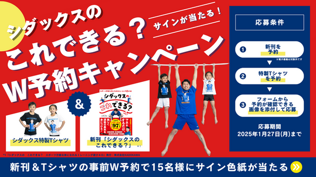 株式会社KADOKAWA(本社:東京都千代田区、取締役 代表執行役社長 CEO:夏野剛)は、体操系YouTuber・シダックスの初著書『シダックスの これできる? スポーツ万能な体になれるトレーニング遊び40』と特製Tシャツの発売を記念し、「『シダックスの これできる?』&特製Tシャツ発売記念!事前予約キャンペーン」を2025年1月15日(水)より実施いたします。