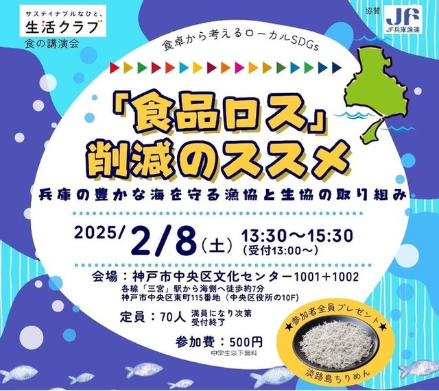 生活クラブ生活協同組合都市生活(本部:兵庫県西宮市、以下生活クラブ都市生活)は2025年2月8日(土)13:30より、神戸市中央区文化センターにて「食品ロス」問題を考える講演会を開催します。食卓から考えるローカルSDGs企画として、生活クラブ都市生活が主催し、兵庫県漁業協同組合連合会が協賛します。