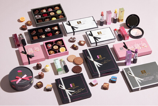 チークのように鮮やかなタブレットショコラとルージュ型ショコラの詰め合わせ。