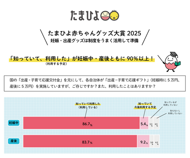 同調査では、出産準備・産後のグッズを揃える際に、2023年1月から始まった各自治体実施の「出産・子育て応援ギフト(妊娠時に5万円分、産後に5万円分)」についての認知度および利用状況を伺いました。その結果、妊娠中・産後ともに「知っていて、利用した」「知っていて、今後利用する予定」を合わせて90%を超えることがわかりました。