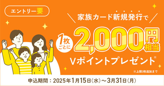 三井住友カード株式会社(本社:東京都江東区、代表取締役社長:大西 幸彦、以下:三井住友カード)は、2025年1月15日(水)より家族カード追加キャンペーンを実施いたします。期間中に、対象カードで期間中にエントリーのうえ、家族カードを追加いただくと、1枚追加ごとにもれなく2,000円相当のVポイントをプレゼントいたします。(上限3枚まで)