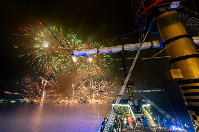 冬は空気が澄んで花火がきれいに見える季節です。海賊船のデッキや特別船室などから、湖上に打ち上がる2,000発の色鮮やかな花火の景色をお楽しみください。