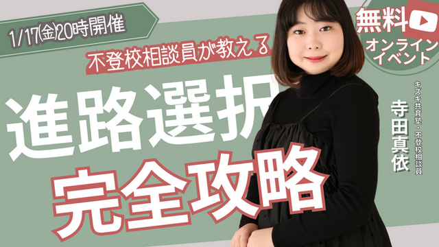 2025年1月17日(金)20:00~20:30、株式会社キズキが運営するウェブメディア「不登校オンライン」は、進級・進学に悩む保護者向けの無料のオンラインイベント「【【進路未定で不安な方へ】不登校相談員が教える進路選択の”やることリスト”作り方~「何から始める?」保護者のギモンを一気に解決!~」を開催します。