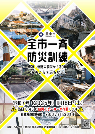 豊中市は、阪神・淡路大震災30年の事業として、1月18日(土)に全市一斉防災訓練を実施します。これは、市民の防災意識の向上を図るとともに、災害時における地域と行政の協力体制を築くことを目的とした本格的な実働訓練です。一部校区においては、警察や自衛隊、大阪DWAT(大阪災害派遣福祉チーム)等と連携した訓練も実施します。