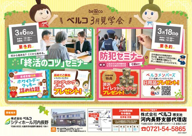 株式会社ベルコ 堺支社 河内長野支部代理店は、2025年3月18日(火)に「防犯セミナー」を開催いたします。このイベントは、地域の皆さまに安全で安心な暮らしを提供することを目的とし、持続可能な社会の構築を目指した取り組みとして実施します。