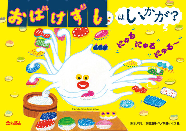 「お寿司ってきれいですよね。形よく握られたシャリの上に、赤いまぐろ、オレンジ色に光るいくら、黄色のたまご……何だか宝石のよう。でももし、おばけがお寿司を握ったら? 握り方が全然違うかもしれないし、見たこともないような魚が乗っていたりして! ……なんて想像しながら書きました。おばけずし、ぜひご賞味ください。」〈苅田澄子〉