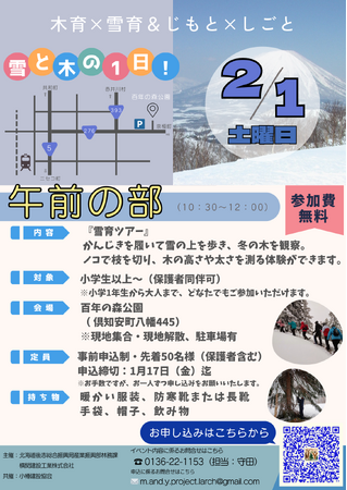 午前の部では、かんじきを履いて雪の上を歩き、冬の木を観察したり、ノコで枝を切り、木の高さや太さを測る体験ができる「雪育ツアー」を倶知安町の百年の森公園で行います!