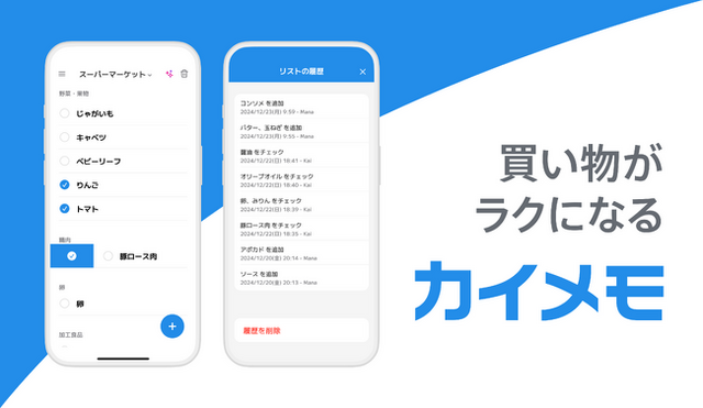 - カイメモをご利用の家族や仲間で買い物リストをシェアできます。入力やチェック、削除の操作履歴を残すことで、いつ買ったか、誰が操作したのかも一目で分かります。