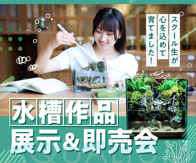 2025年2月15日(土)~16日(日)に販売実習の一環として「水槽展示作品展&即売会」を開催します。スクール生が愛情込めて育てた生きものや水草、手作りのアクアリウムやコケテラリウムなどを販売。ワークショップでは、コケテラリウムやボトルアクアリウム作りを体験できます。