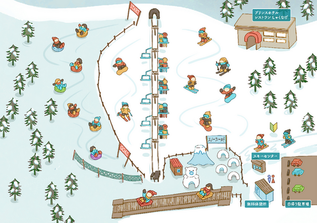 ゲレンデ滑走面(最大斜度20°、平均斜度13°)の一部に造成した滑走距離約600m、高低差78mのスキーコースをチュービンで滑走します。また、営業中のスノーフィールド内には「かまくら」や「巨大雪山」を増設し、お子さまや海外のお客さまの「かまくら」体験や、高さ5m程になる巨大雪山では登ったり滑ったりして全身で「雪」を体感していただけます。