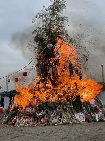 海の公園で行う横浜金沢冬の風物詩「どんど焼き」は、今回で30回目を迎えます。お正月に使った門松やしめ縄、祈願成就した「だるま」などを持ち寄って焚き、一年の無病息災を願います。