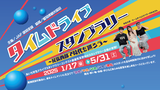 JAF(一般社団法人 日本自動車連盟)愛知支部(支部長 今枝 実)は、「あいち学生ドライブスタンプラリーコンテスト2024」で最優秀賞を受賞した「タイムドライブスタンプラリー ~尾張西部で時代を巡ろう~」(中京大学総合政策学部2年生の男女3名からなる「チームタイムトラベラー」考案)を2025年1月17日(金)から5月31日(土)まで開催します。