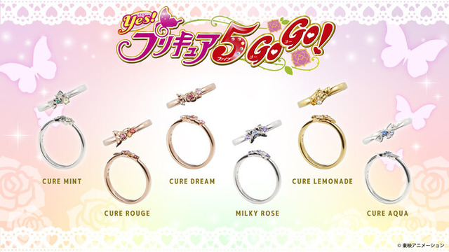 Yes!プリキュア5GoGo!に登場する、キュアドリーム、キュアルージュ、キュアレモネード、キュアミント、キュアアクア、ミルキィローズをイメージしたシルバーリングです。