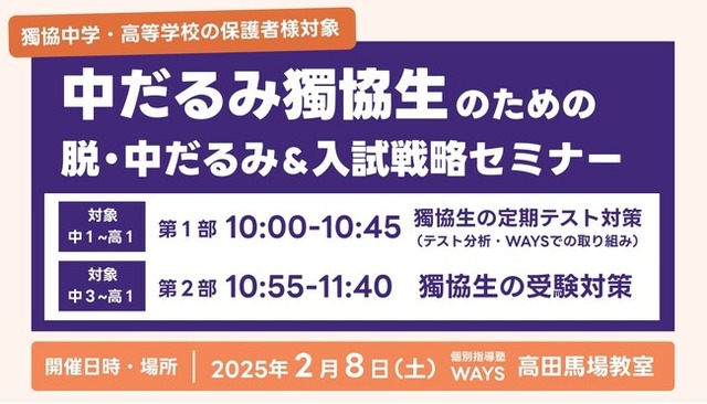 株式会社メイツ(本社:東京都新宿区 代表取締役:遠藤尚範)が運営する『中高一貫校専門 個別指導塾WAYS(以下、WAYS)』はこの度、獨協中学・高等学校に通う生徒の保護者様を対象に、脱・中だるみと大学入試に向けたおすすめの対策法を、WAYSでの取り組みも踏まえてご紹介するセミナーを開催いたします!