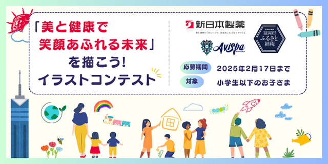 新日本製薬 株式会社(本社:福岡市、代表取締役社長CEO:後藤孝洋)は、アビスパ福岡株式会社、福岡市のご協力のもと、全国の小学生以下のお子さまを対象に、「美と健康で笑顔あふれる未来」の絵を募集するイラストコンテストを開催します。