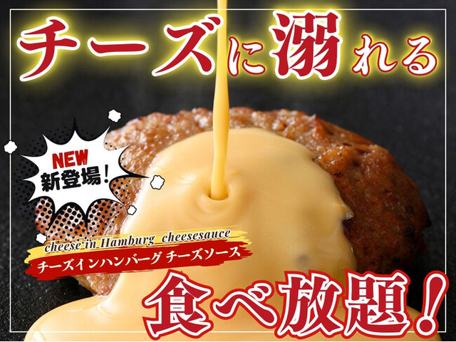 ジューシーで旨味たっぷりの肉汁と、12種類ブレンドした濃厚なチーズが溢れる、現在ご提供中のチーズインハンバーグに、爽やかな酸味とマイルドな味わいの『チーズソース』を上からたっぷりと!