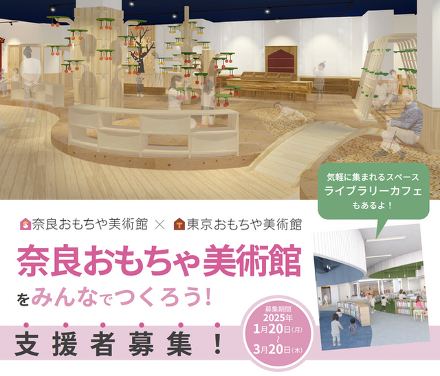 2025年3月20日に、関西初となる「奈良おもちゃ美術館」がグランドオープンします。東京おもちゃ美術館を運営する認定NPO法人芸術と遊び創造協会の総合監修のもと、奈良県三郷町がまちづくりの一環として設置し、社会福祉法人 檸檬会が、三郷町と指定管理契約を締結し運営します。
