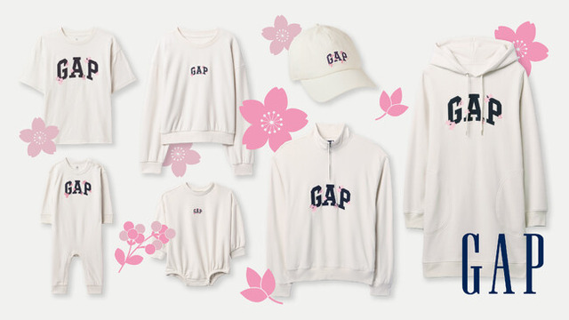 GAPロゴと桜モチーフが融合した日本限定のSAKURAコレクションで、春の装いをお楽しみください。