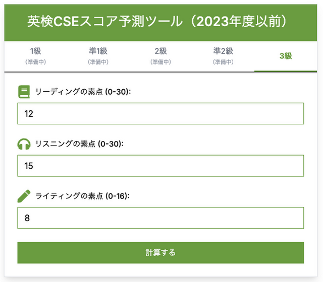 英検(R)CSEスコア予測ツール(旧):https://apps.studystudio.jp/cse-calculator-old