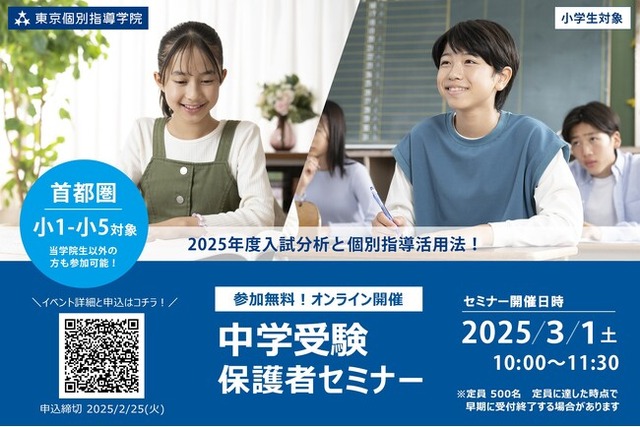 個別指導塾のパイオニアとして日本全国に267教室(2025年1月21日時点)を展開するベネッセグループの株式会社東京個別指導学院(本社:東京都新宿区、代表取締役社長:松尾 茂樹)は、来る3月1日(土)、 中堅校に特化した中学受験保護者セミナーをオンラインで実施いたします。当社にお通いのお客様に限らず、中学受験をお考えの小学生の保護者のどなたでもご参加いただけます。対象エリアは首都圏で、定員500名の事前申し込み制です。「ボリュームゾーン」「ボリュゾ」と称される中堅校における注目校の入試問題分析などについて、模試と受験のエキスパートがデータを駆使して解説します。東京個別指導学院のお客様に向けては、第2回セミナーを4月19日(土)に開催します。