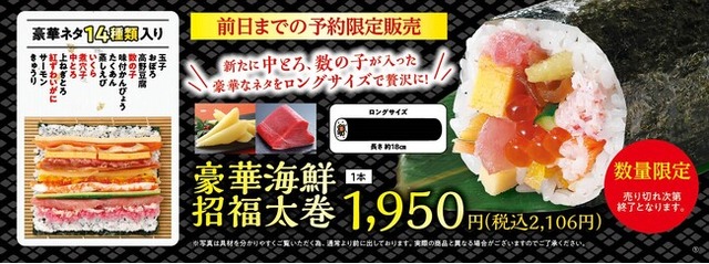 がってん寿司の恵方巻は、9種類の具だくさん海鮮恵方巻から黒毛和牛の恵方巻、お子様に人気のサラダ恵方巻を、食べやすいハーフサイズ(9cm)に仕上げた商品や、さらに贅沢を追求した「豪華海鮮招福太巻」はネタにこだわって作り上げております。この機会に是非ご堪能くださいませ。