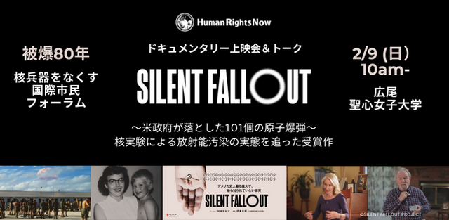 世界で戦争が続き、核の脅威が高まっている今、核兵器廃絶は世界中の人にとっての緊急の課題です。市民、学生、議員、役人、経済人、アーティストなど、世代や国境をこえて大勢の人が幅広く集まるこの機会に、ヒューマンライツ・ナウ(HRN)は、アメリカにおける核実験による放射能汚染の被害実態を追ったドキュメンタリー映画「SILENT FALLOUT」の上映会を開催します。上映の後には、ドキュメンタリー映画監督/テレビディレクターの伊東英朗氏によるトーク(オンライン中継)も予定しています。HRNからは、伊藤和子副理事長が登壇いたします。